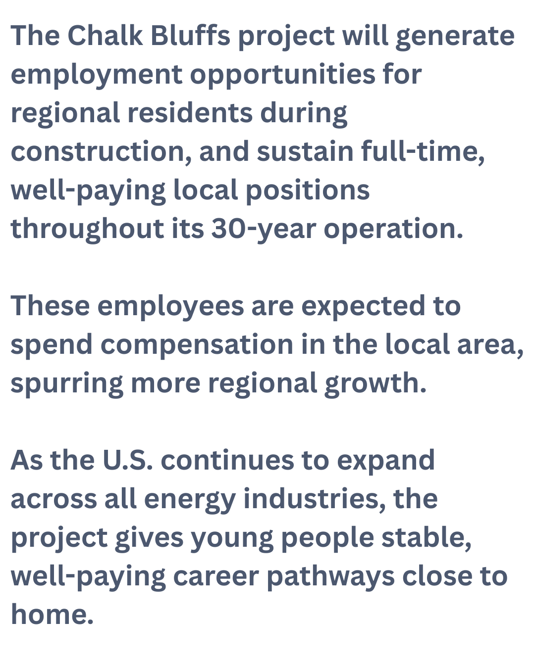 The proposed Chalk Bluffs project will generate significant new and diversified tax revenue at the local, regional, and state levels—driving long-term economic growth, creating good-paying jobs, and providing guaranteed, resilient cash flow to local schools and municipalities for decades to come.